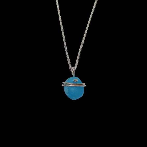 Stunning aqua sea glass with sterling silver wraps and hung with a silver rope chain
