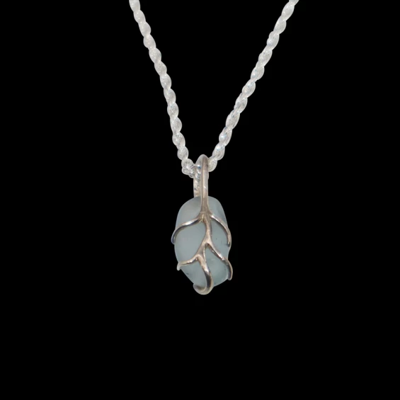 Beatiful aqua blue sea glass wrapped in sterling silver branches and hung with a stering silver rope chain design.