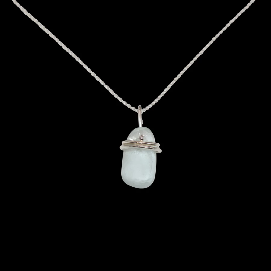 Clear Sea Glass from Western Scotland wrapped in sterling silver wire and silver chain.