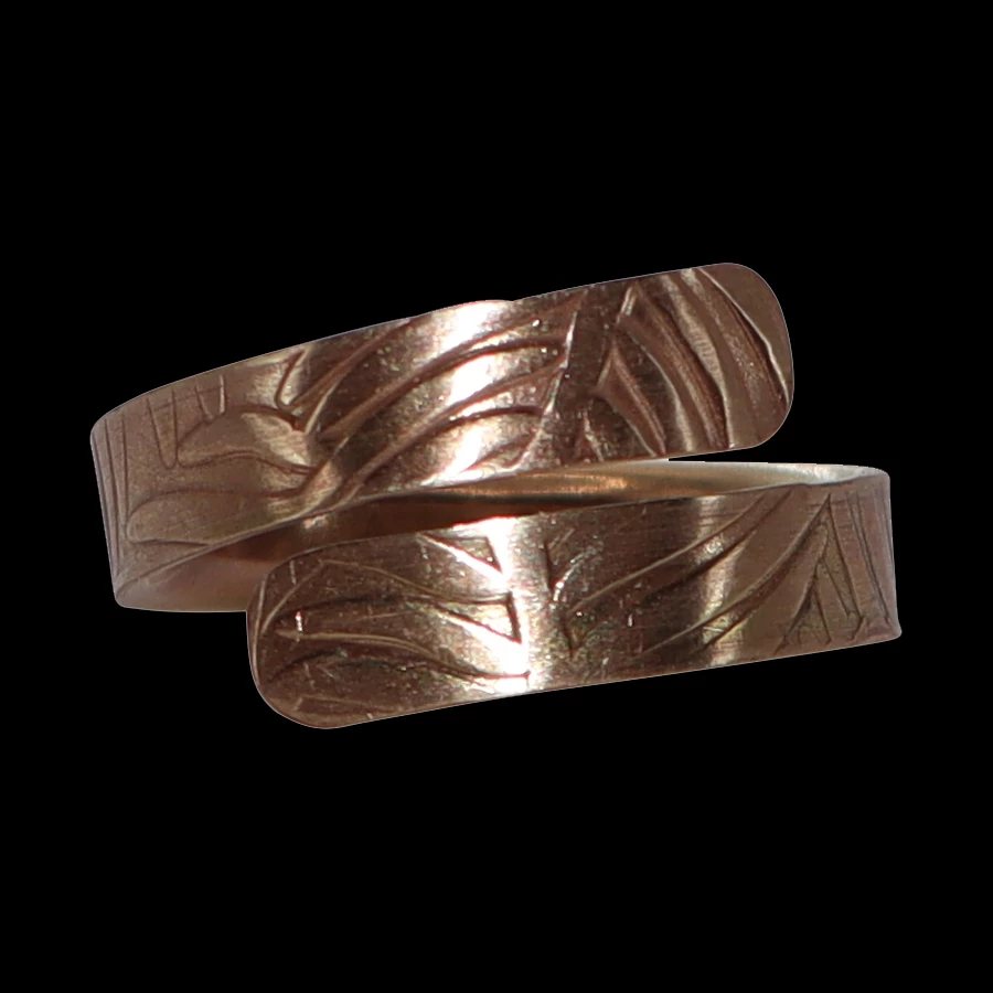 This is a one of a kind, half round gold filled wire put thru a press with a leaf print and turned over a mandrel for shape and geometry.