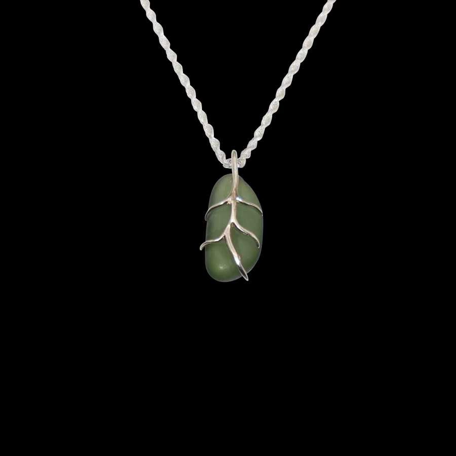 Small green sea glass wrapped in sterling silver branches