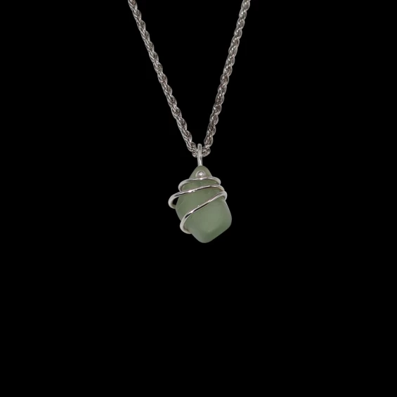 Small pale green sea glass necklace wrapped in 3 strands of silver